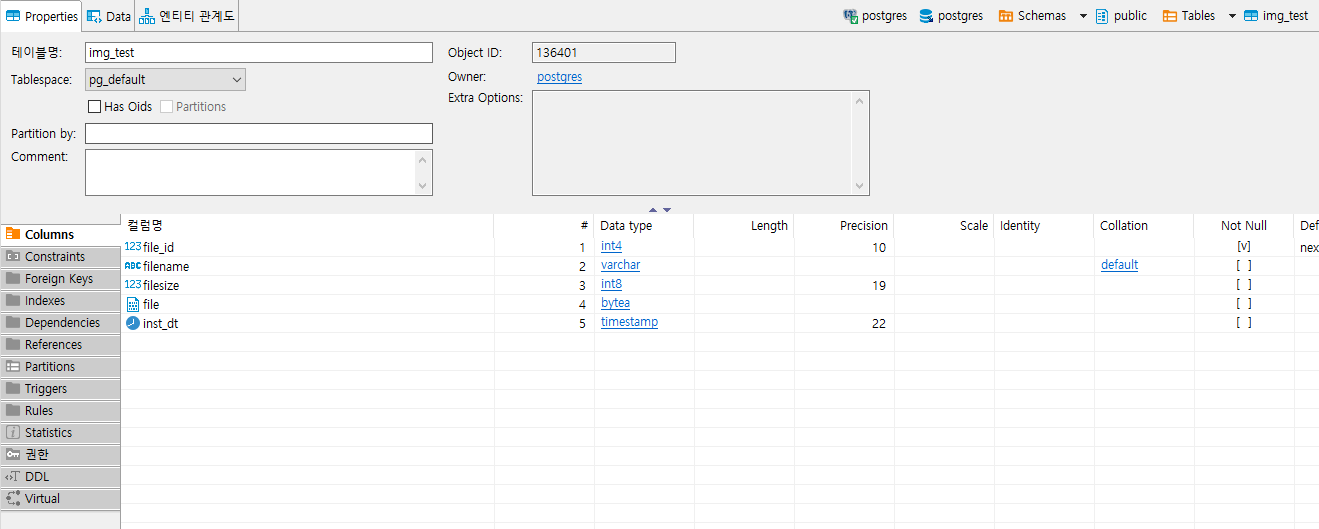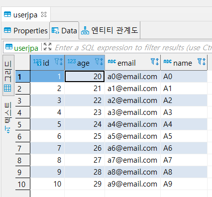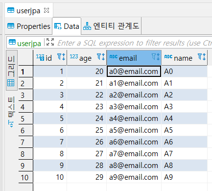 - 테스트 테이블: userjpa (Jpa Option: create를 통한 자동 생성함)