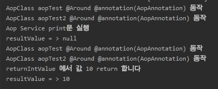 System.out.println("AopClass aopTest @Around @annotation(AopAnnotation) 동작");